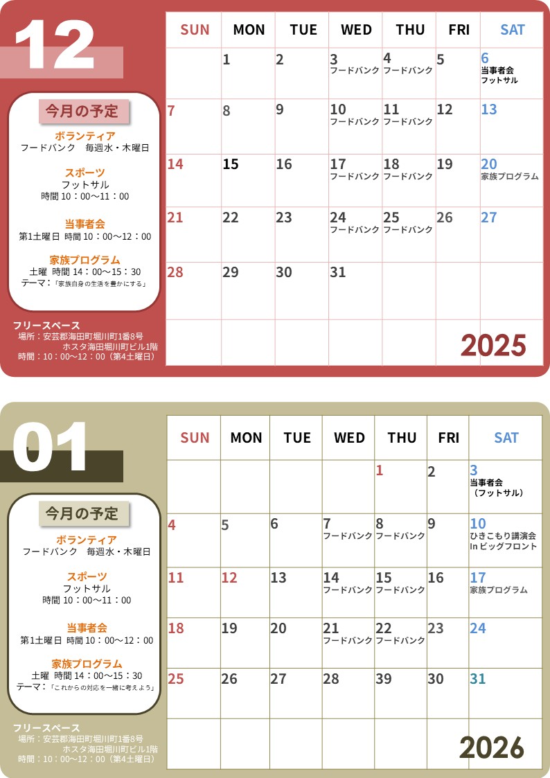 - 安芸郡海田町堀川町南1-8ホスタ海田堀川町ビル1階に集合し、近隣の公園やグランドで活動